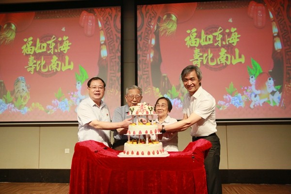 在温馨的生日歌中,党委书记丘国新、院长戎利民和寿星代表梁锦华教授、余步云教授共同上台为大家切蛋糕祝寿。医院领导亲自为到场的每一位寿星送上祝福和鲜花,与寿星们分享喜悦与欢乐,现场充满了温馨祥和的气氛。