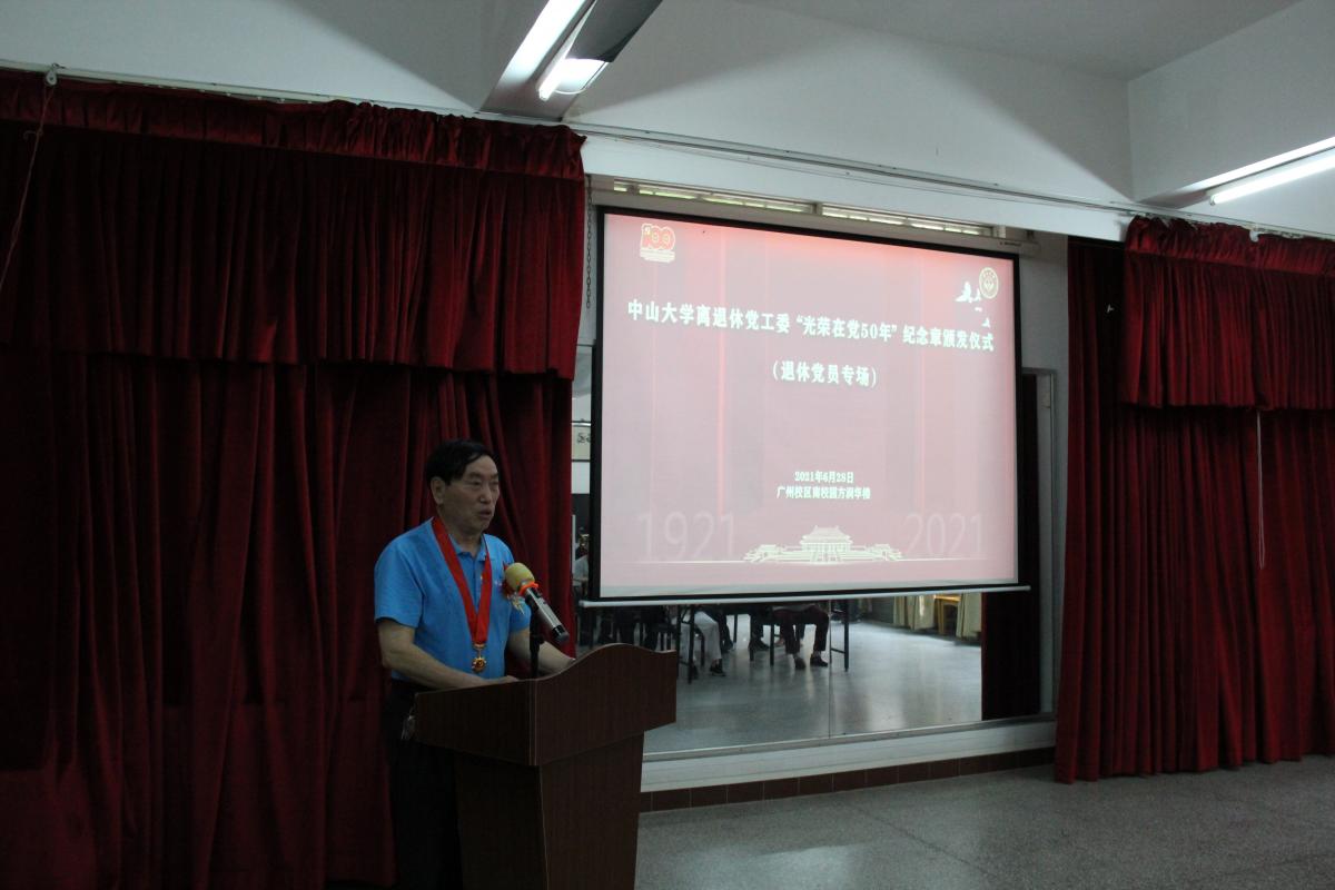 带上熠熠生辉的纪念章,老党员们感到非常光荣,格外激动,十分感谢党的关心关爱。退休党支部书记伍金春代表老党员作了发言,他回忆了党培养他成长的过程,抒发了对党无限的热爱,表达了永葆政治本色、坚决听党话、跟党走的决心,并表示将继续发挥独特优势,为党的事业和学校的建设发展做出应有的贡献!