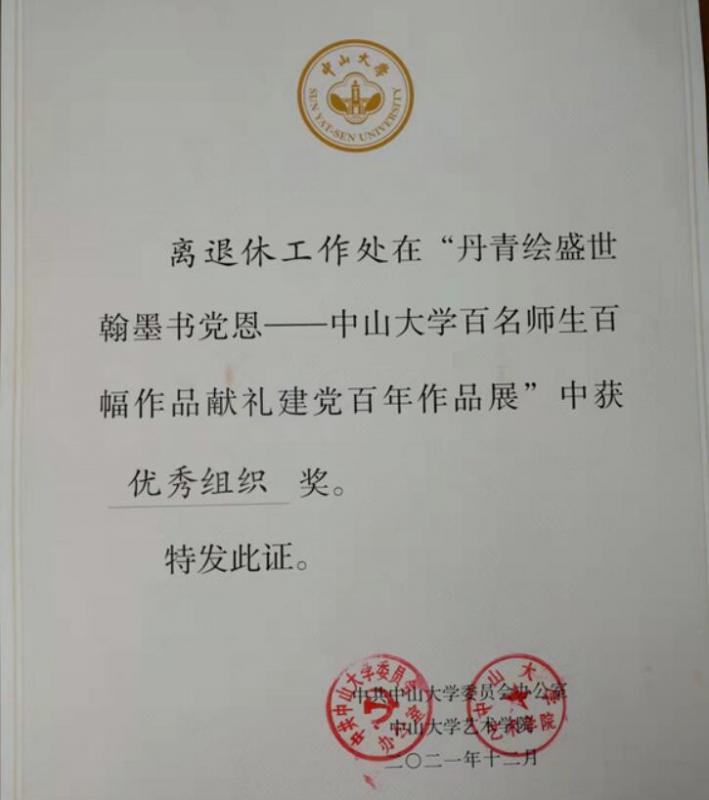 为庆祝中国共产党成立100周年,深入贯彻落实《中共中央办公厅国务院办公厅关于全面加强和改进新时代学校美育工作意见的通知》,学校举办了“丹青绘盛世 翰墨书党恩”艺术作品征集展示活动。离退休工作处精心组织,迅速联系、协助秋菊诗书画摄影协会组织老同志积极参与,认真准备。此次活动,离退休工作处推荐报送了20幅书法绘画作品,成绩喜人。其中《红船精神》(作者:麦卫东)获得一等奖,《中共三大会址》(作者:马越)、《牡丹花开幸福来》(作者:陈思灵)获得二等奖,《红色的革命摇篮延安》(作者:任建芬)获得三等奖,同时离退休工作处获得了优秀组织奖。